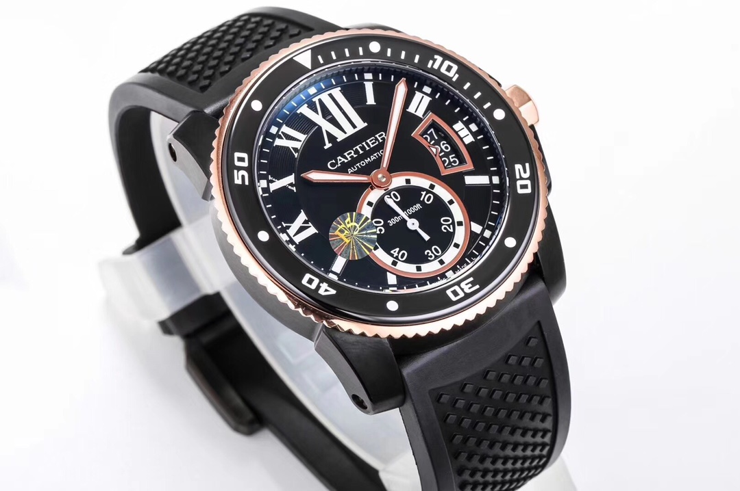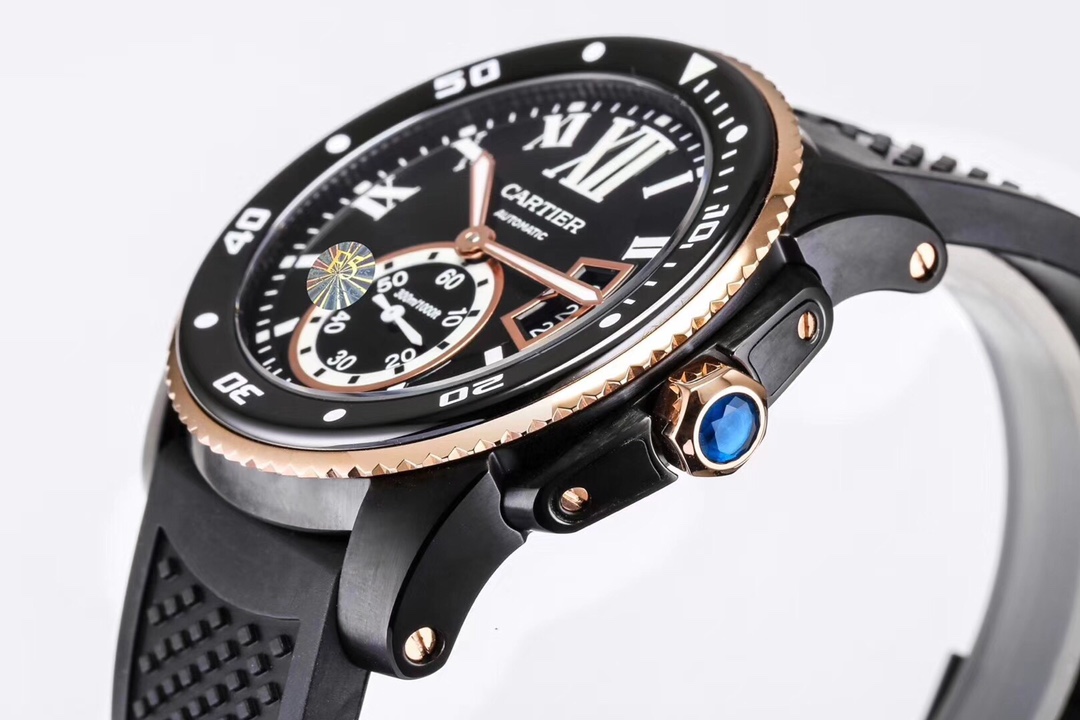 | Cartier Calibre 42mm Blue Dial Black Rose Gold Bezel Black Rubber Strap W2CA0004 | |