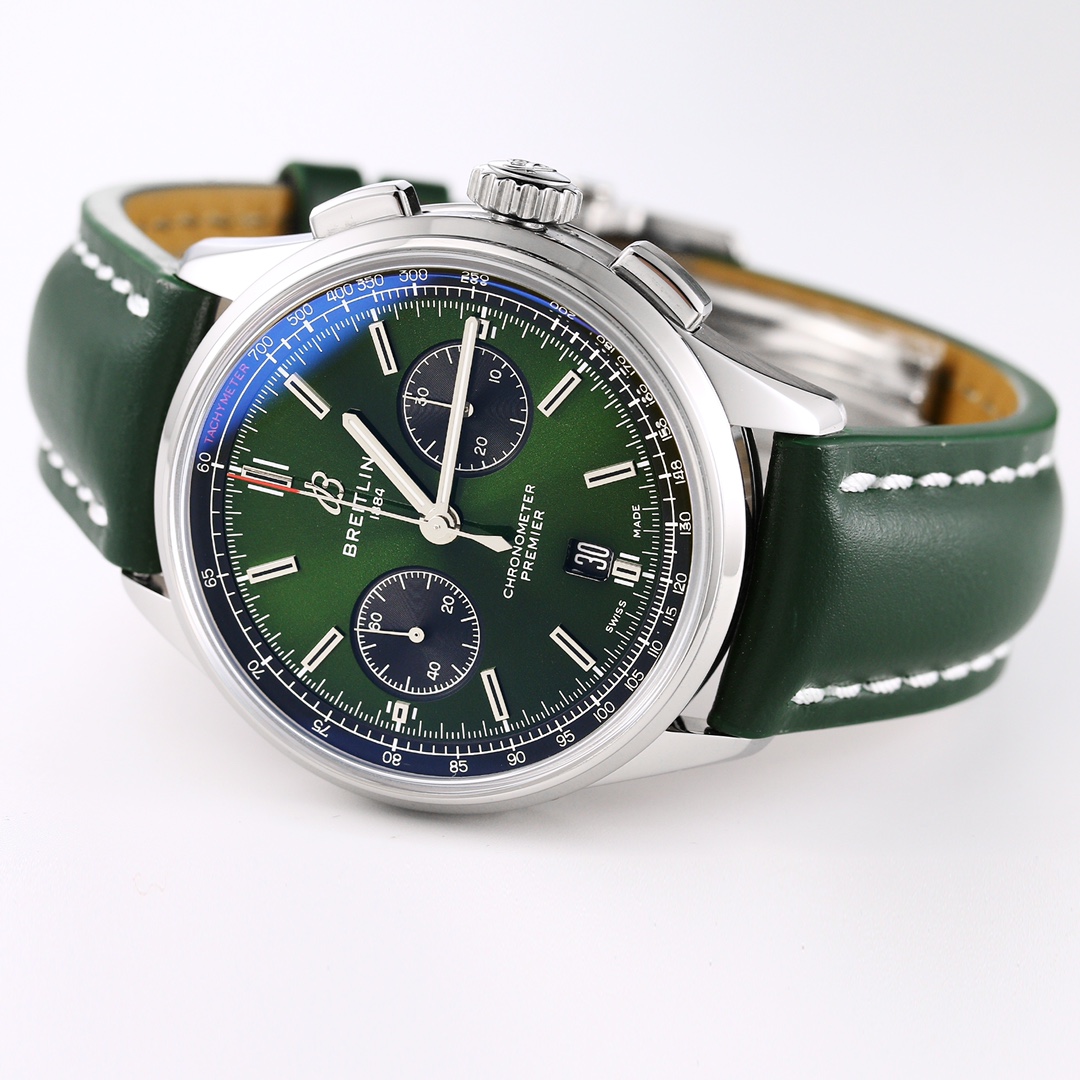 Breitling Premier 42mm Green Black Dial Steel Bezel Green Leather Strap AB0118A11L1X1
