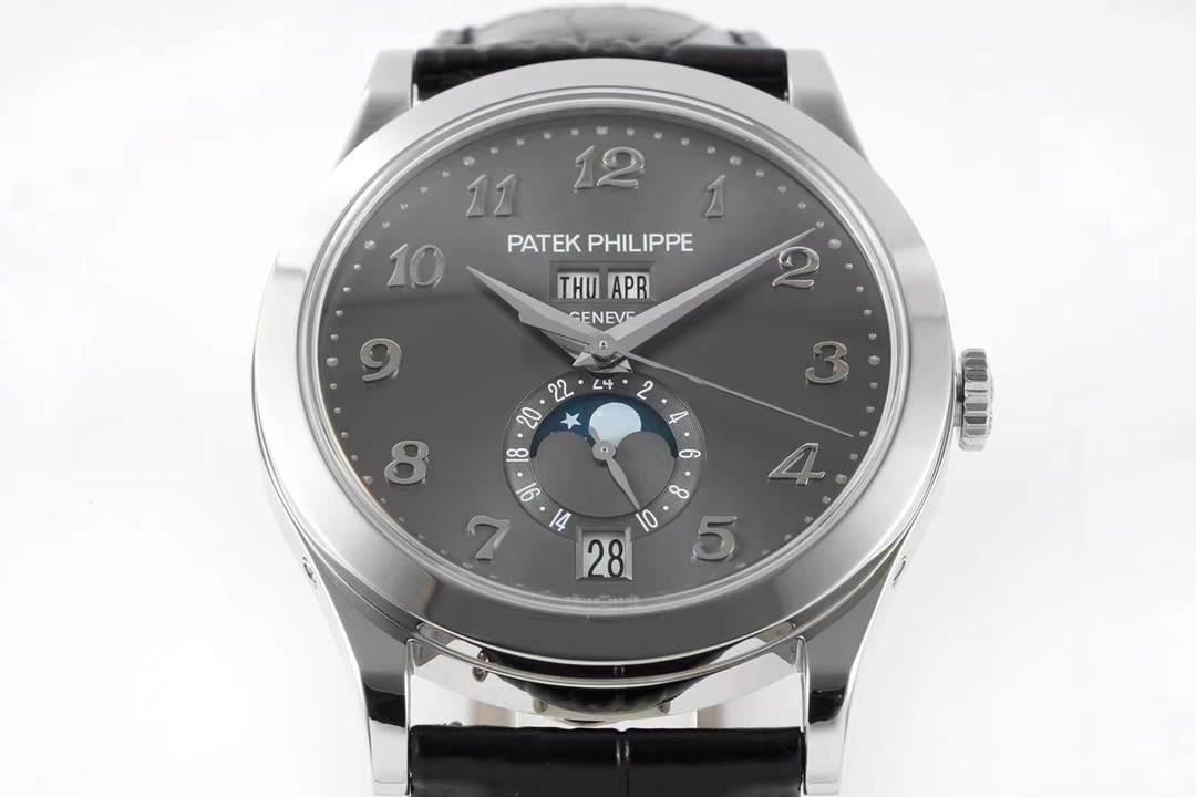 Patek Philippe Complications 38.5mm Carbon Gray Dial Steel Bezel Black Leather Strap 5396G-014