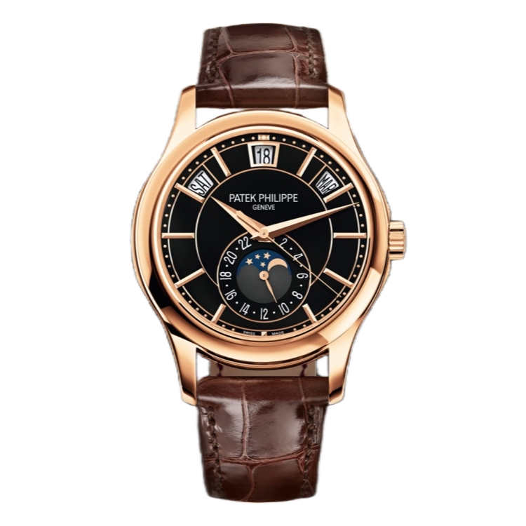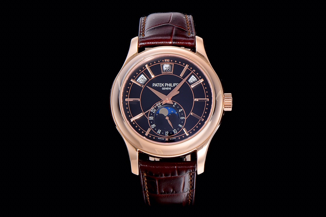 Patek Philippe Complications 40mm Black Dial Rose Gold Bezel Brown Leather Strap 5205R-010