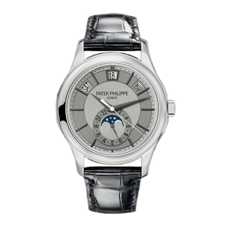 Patek Philippe Complications 40mm Silver Gray Dial Steel Bezel Black Leather Strap 5205G-001