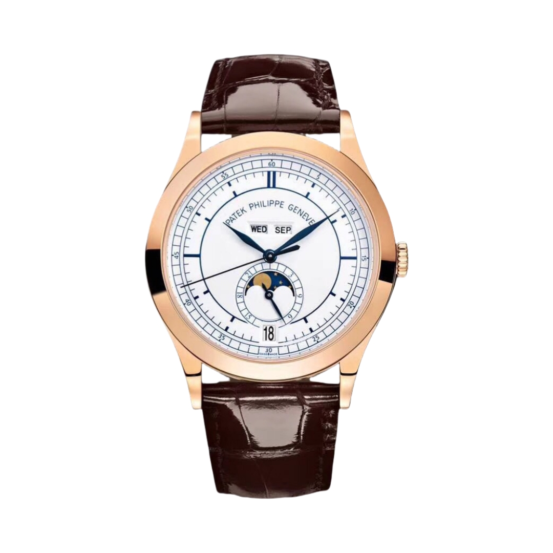 Patek Philippe Complications 38.5mm White Blue Dial Rose Gold Bezel Brown Leather Strap 5396R
