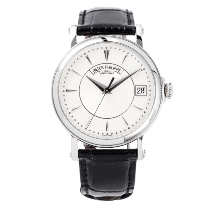 Patek Philippe Calatrava 38mm White Dial Steel Bezel Black Leather Strap 5153G-010