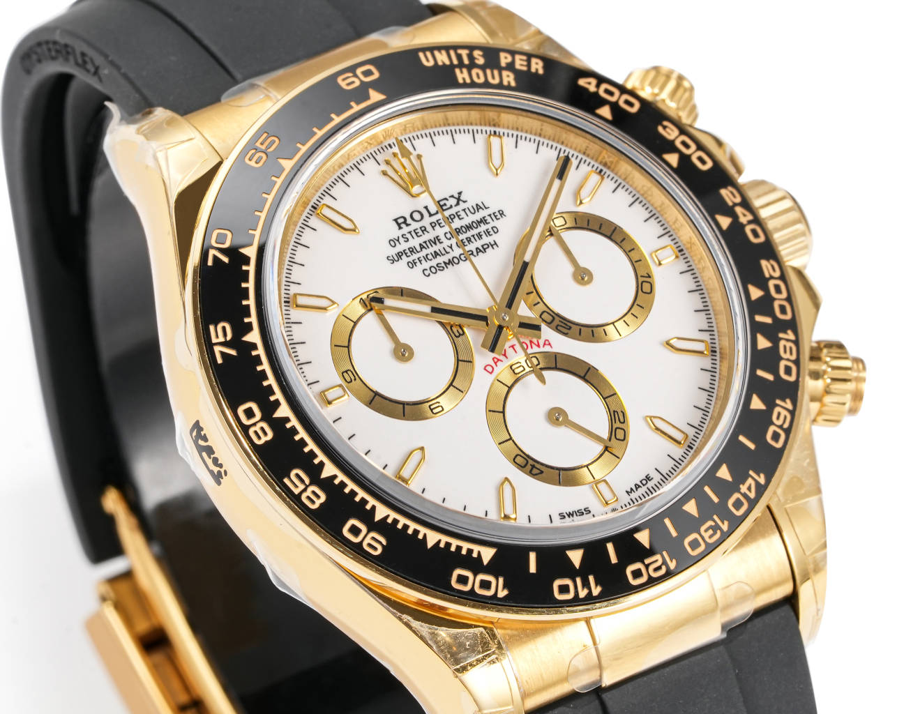 | Rolex Daytona Cosmograph 40mm Dial White Yellow Gold Black Strap 116518-0002 | |