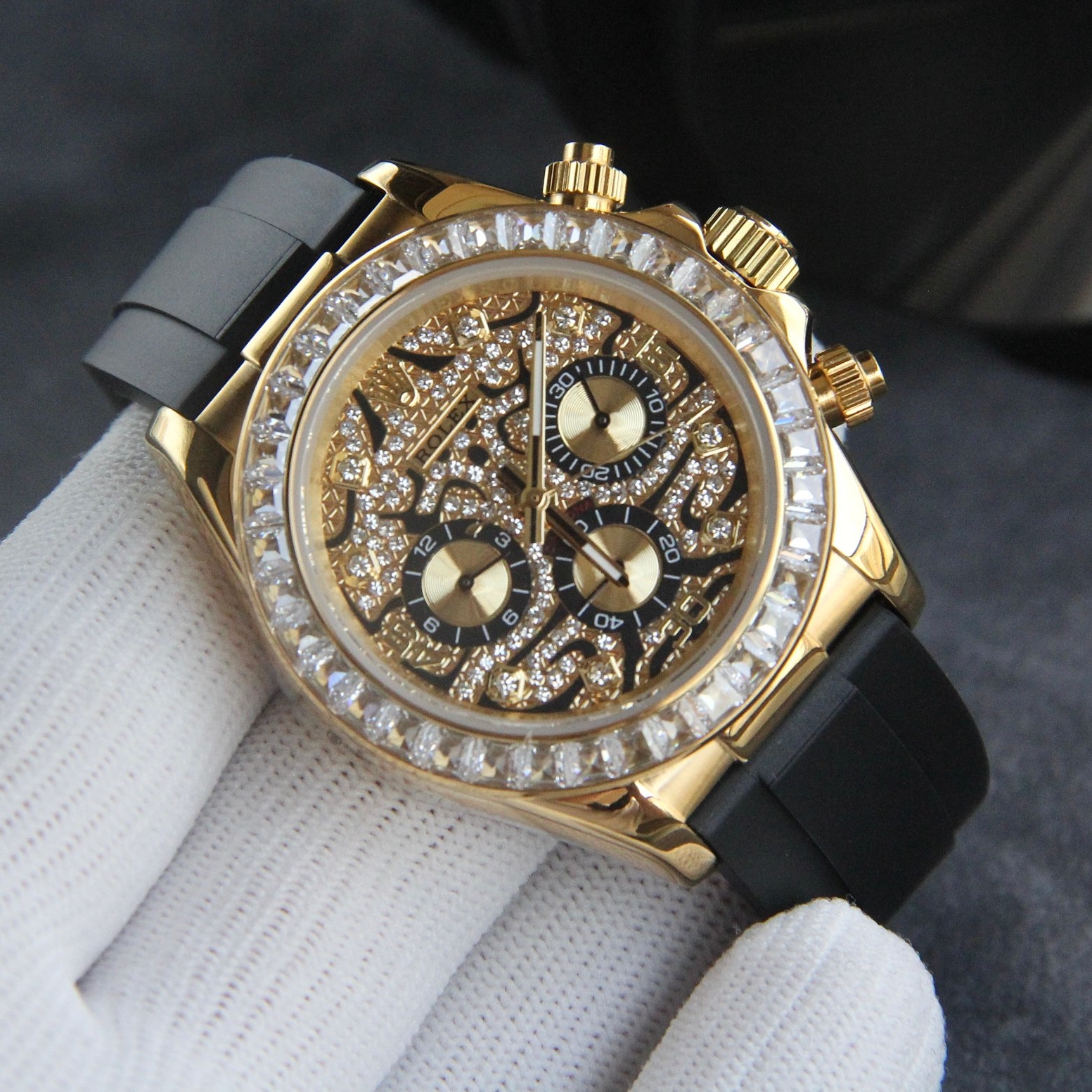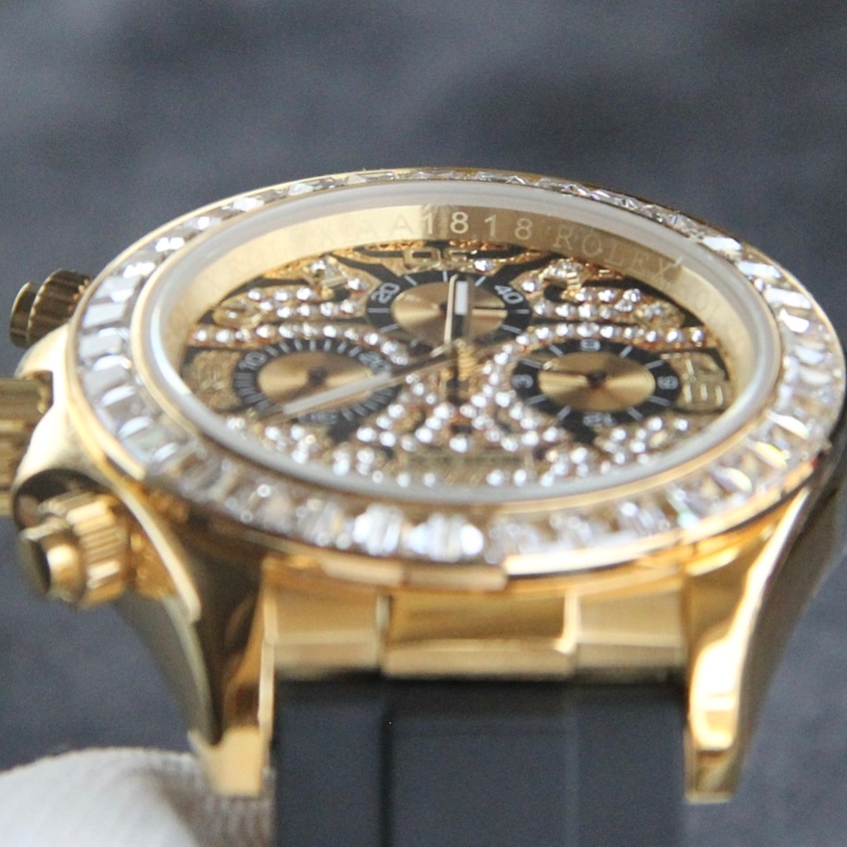 | Rolex Daytona 40mm Yellow Gold Diamond Dial Diamond Bezel Black Rubber Strap 116588TBR Eye of the Tiger | |
