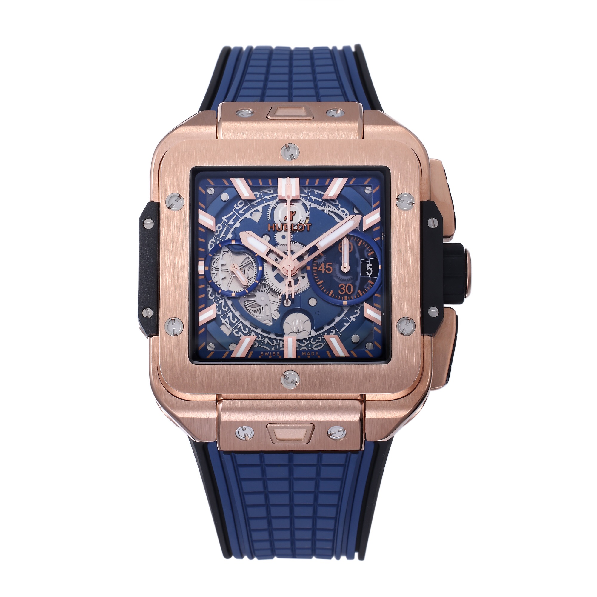 Hublot Square Bang Unico 42mm Grey Dial Rose Gold Bezel Blue Rubber Strap 821.OX.5180.RX