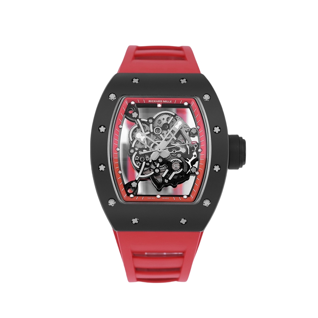 | Richard Mille RM 055 49.90mm x 42.70mm Grey Hollow Dial Red Black Carbon Fiber Bezel Red Rubber Strap | |