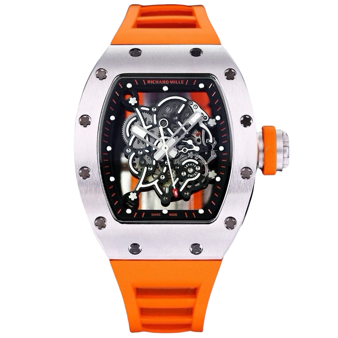 | Richard Mille RM 055 49.90mm x 42.70mm Grey Hollow Dial Titanium Bezel Orange Rubber Strap | |