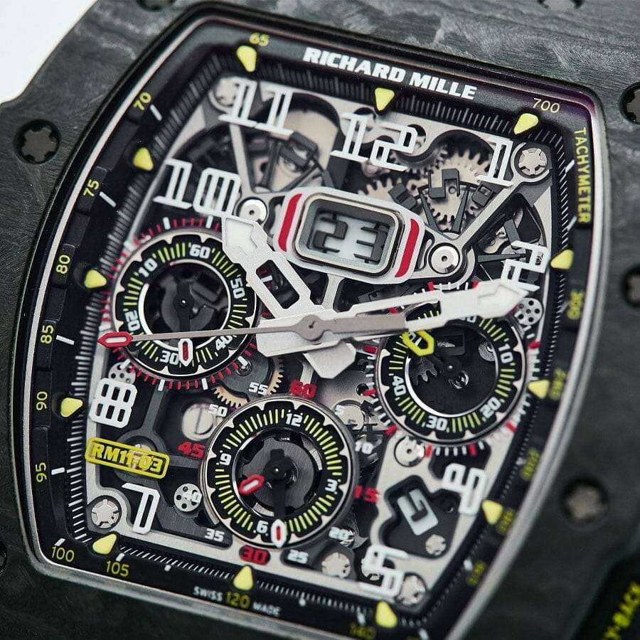 | Richard Mille RM 11-03 49.94mm x 44.50mm Dial Black Carbon Fiber Bezel Black Rubber Strap | |