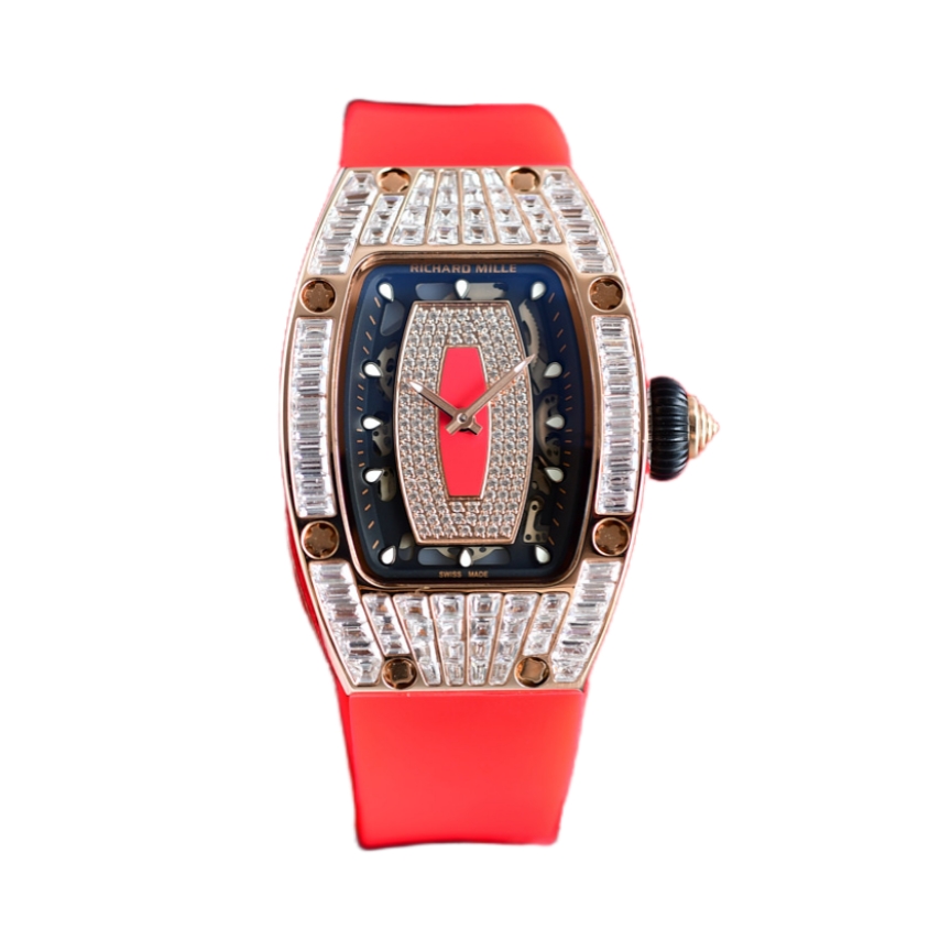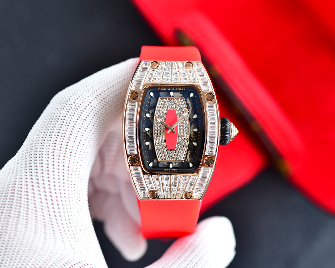 | Richard Mille RM07-01 45.66mm x 31.40mm Diamond Red Dial Rose Gold Square Diamond Bezel Red Rubber Strap Ladies Woman | |
