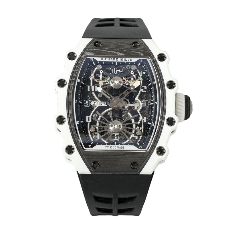 | Richard Mille RM21-02 Ti CA FQ 42.68mm x 50.12mm Grey Dial Black White Ceramics Bezel Black Rubber Strap | |